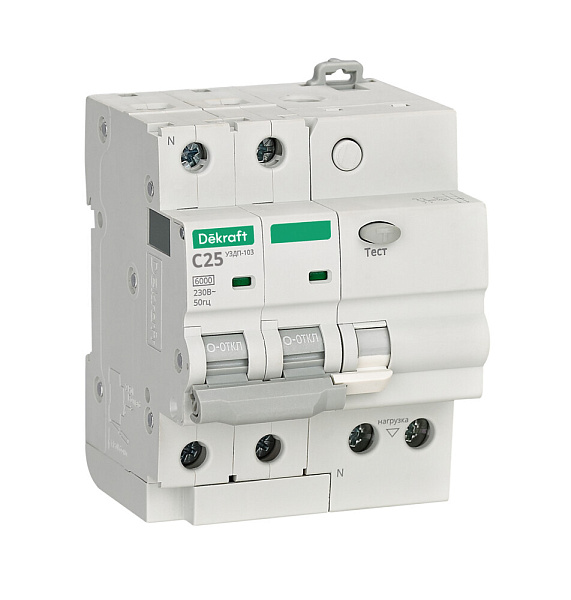 Устройство защиты от дугового пробоя серии УЗДП-103 Dekraft; 2P; номинальный ток 25 А; отключающая способность 6кА.