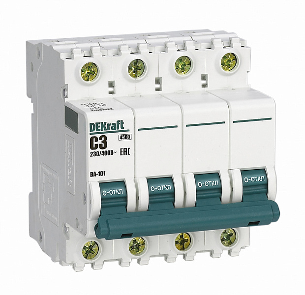 Автоматический выключатель серии ВА-101 Dekraft; 4P; номинальный ток 3 А; характеристика С; отключающая способность 4,5 кА.