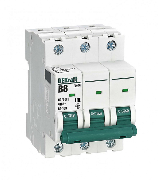 Автоматический выключатель серии ВА-103 NEW Dekraft; 3P; номинальный ток 8 А; характеристика B; отключающая способность 6 кА, что позволяет использовать аппараты в качестве вводных.