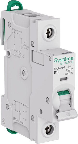Автоматический выключатель S9FH, серии Systeme9, Systeme Electric, 1-полюсный, номинальный ток 10 А, характеристика D, Icn = 10 кА, Icu = 15 кА.