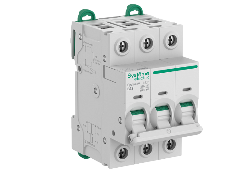 Автоматический выключатель S9FH, серии Systeme9, Systeme Electric, 3-полюсный, номинальный ток 32 А, характеристика B, Icn = 10 кА, Icu = 15 кА.