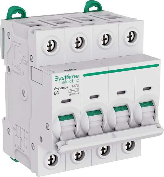 Автоматический выключатель S9FH, серии Systeme9, Systeme Electric, 4-полюсный, номинальный ток 3 А, характеристика B, Icn = 10 кА, Icu = 15 кА.