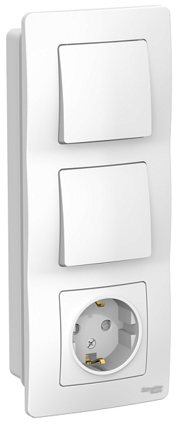 Блок Systeme Electric (ранее Schneider Electric) BLANCA (белый, скрытой установки) предназначен для сетей до 250В, состоит из розетки на 16А с заземлением и шторками и двух одноклавишных выключателей на 10А.