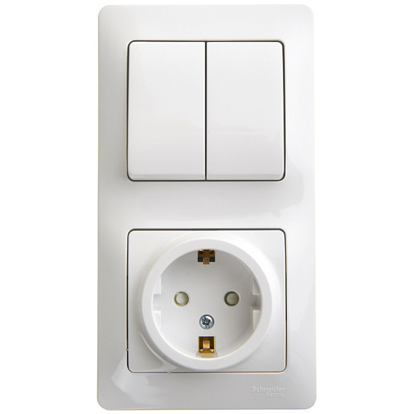 Блок комбинированный Systeme Electric (ранее Schneider Electric) серии Glossa (в сборе, цвет белый) предназначен для сетей до 250 В, состоит из розетки с заземлением и шторками на 16 А и 2-клавишного выключателя на 10 А.