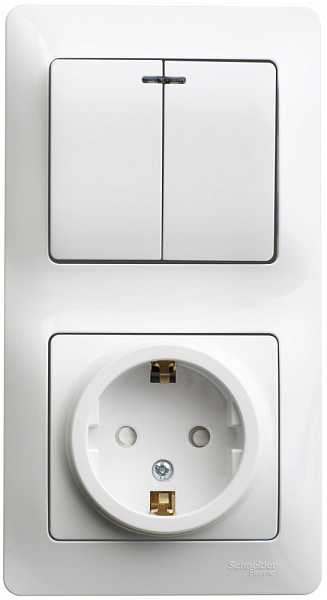 Блок комбинированный Systeme Electric (ранее Schneider Electric) серии Glossa (в сборе, цвет белый) предназначен для сетей до 250 В, состоит из розетки с заземлением и шторками на 16 А и 2-клавишного выключателя с подсветкой на 10 А.