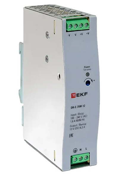 Блоки питания серии DR напряжениями 5/12/24/48 В, EKF устанавливаются на DIN рейку и предназначены для преобразования входного переменного напряжения 100-240 В в постоянное стабилизированное напряжение 5,12,24 или 48 Вольт.