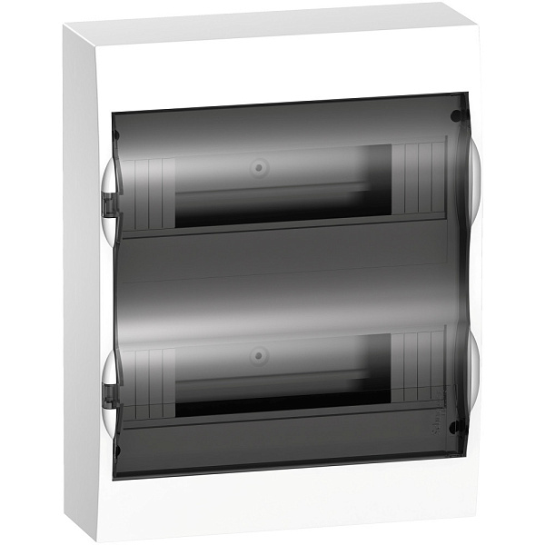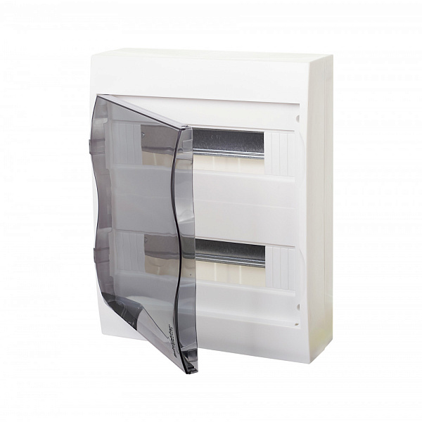 Щиток вешается на стену, имеет 2 DIN-рейки для установки 24 аппаратов по 18 мм.