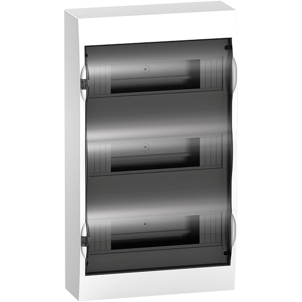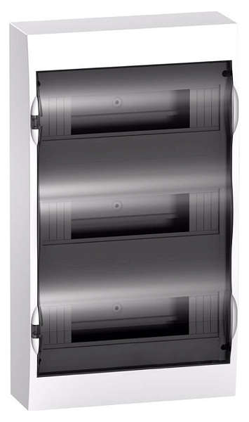 Щиток вешается на стену, имеет 3 DIN-рейки для установки 36 аппаратов по 18 мм.