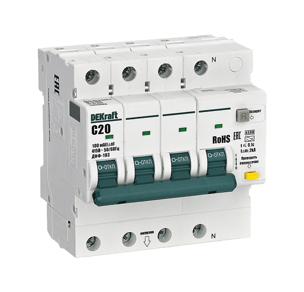 Автоматические выключатели дифференциального тока серии ДИФ-103 4,5кА NEW Dekraft; 3P+N; номинальный ток 20 А; ном.