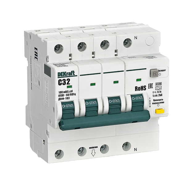 Автоматические выключатели дифференциального тока серии ДИФ-103 4,5кА NEW Dekraft; 3P+N; номинальный ток 32 А; ном.