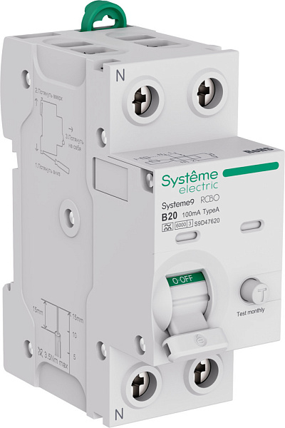 Автоматический выключатель дифференциального тока (АВДТ) S9D, серии Systeme9, Systeme Electric, 1P+N, номинальный ток 20 А, характеристика B, Icn = 6 кА, ток утечки = 100 мА, тип A.