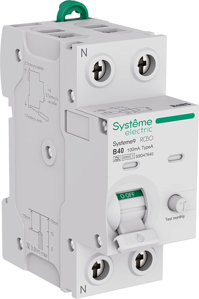 Оснащен двойными безопасными клеммами раздельного монтажа проводников, механизмом мгновенной коммутации, индикатором состояния контактной группы и раздельными индикаторами срабатывания по причине возникновения сверхтока или тока утечки.