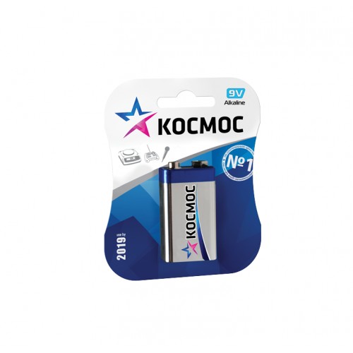 Алкалиновая батарейка 9V (крона) LR 6LR61 Максимум BP-1 КОСМОС KOC6LR61MAX1BL используется для питания игрушек, портативных металлодетекторов, пожарных сигнализаций и других приборов.