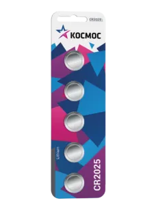 Литиевая батарейка CR2025 5хBL КОСМОС KOC20255BL используется для питания наручных часов, пультов дистанционного управления, светодиодных фонарей и другой техники.