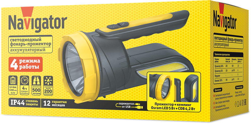 Емкий литий-ионный аккумулятор обеспечивает до 4 часов работы в режиме прожектор 30%