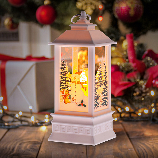 Настольный праздничный светильник EGNDS-06 Снеговик высотой 20 см от бренда ЭРА создаст дома невероятную новогоднюю атмосферу! Корпус светильника-фонаря выполнен из белого ПВХ, имеет на стеклах симпатичный рисунок снеговика в зимнем снежном лесу, а внутри расположена светодиодная лампочка с теплым светом, имитирующая свечу.