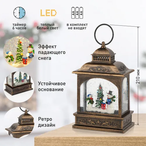 Б0051943) создаст у Вас дома атмосферу уюта и тепла! Светильник фонарь выполнен из ПВХ и окрашен под медь, внутри стекла расположены блестки, создающие эффект падающего снега.