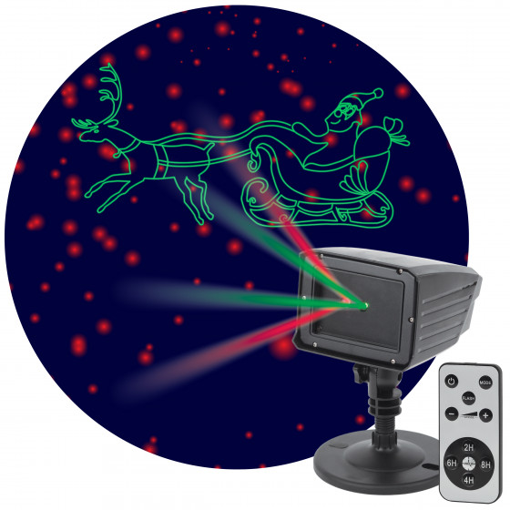 С помощью пульта дистанционного управления, который входит в комплект, вы можете настраивать проекцию под своё настроение: оставить полную картинку (Дед Мороз + звёзды), выбрать только сказочный экипаж (без звёзд) или включить нейтральный звёздный фон.