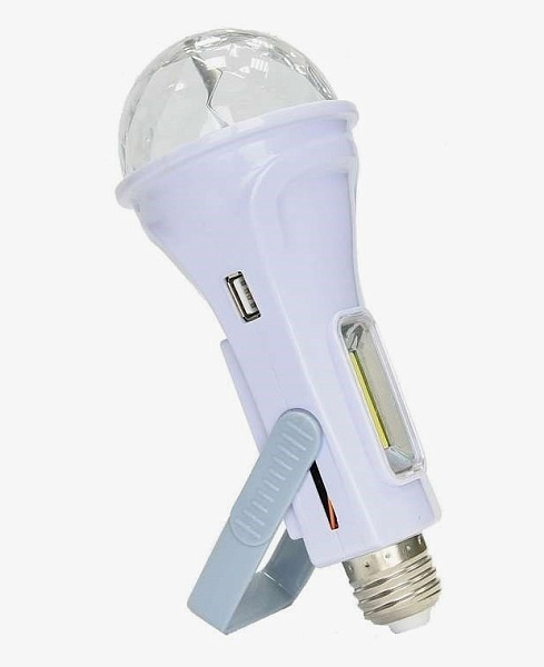 Настоящая «Чудо-лампа» 4 в 1: диско-лампа (в цоколе Е27), диско-светильник (настольный или подвесной, работает от аккумулятора), powerbank для телефона (выход USB) и фонарик.