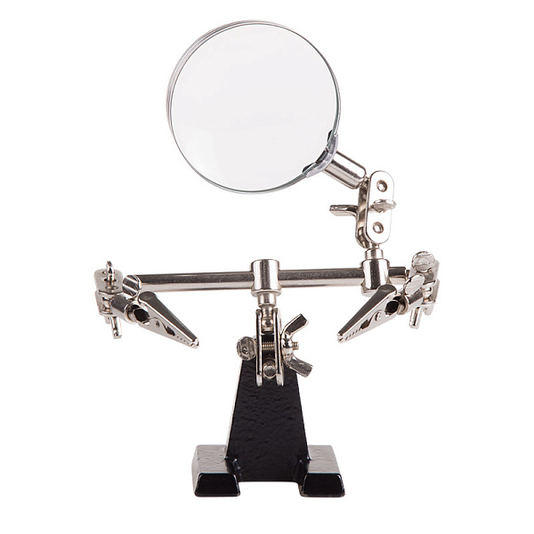 Держатель «третья рука» с лупой х3 REXANT служит, главным образом, при проведении паяльно-сборочных работ в электронике, ювелирном деле, сборке и ремонте для зажима мелких деталей в любом нужном положении, когда не хватает двух рук.