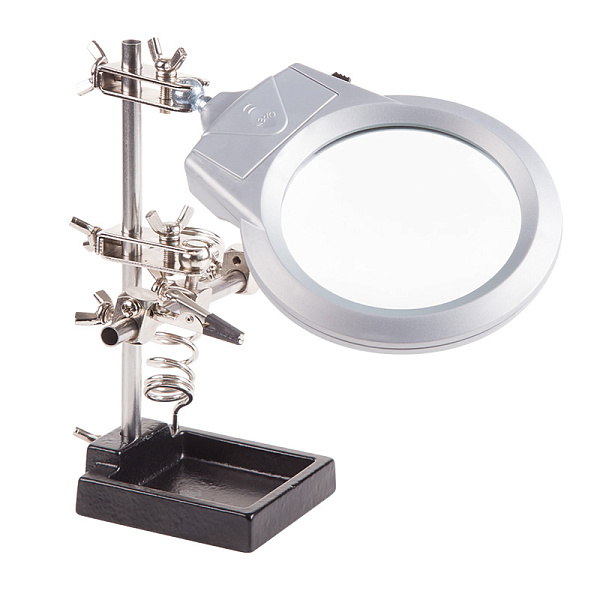 5 со светодиодной подсветкой (возможность регулировки положения, диаметр линзы 85 мм) и спиралевидной подставки под паяльник с никелевым покрытием.