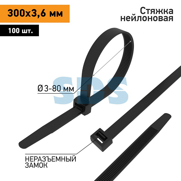 Хомут размером 300x3,6мм черного цвета обеспечивает надежную фиксацию и обладает высокой прочностью.