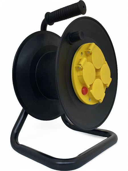 Пластиковая катушка D225мм без провода на металлической стойке предназначена для намотки кабеля и использовании как удлинитель для удалённой работы на строительных площадках или дачных участках.