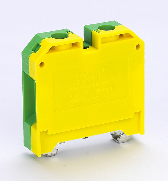 мм; цвет – желто-зеленый; материал корпуса - полиамид; материал клемм и винтов – латунь; монтаж - защелкиванием на DIN-рейку; количество в упаковке – 20 шт.