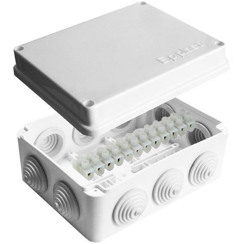 Коробка распределительная для наружного монтажа, 150х110х70 мм; 10 выходов; 10 гермовводов, клеммная колодка 10А, 12 контактов.