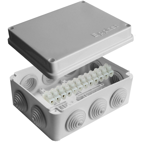 Коробка распределительная для наружного монтажа, 150х110х70 мм; 10 выходов; 10 гермовводов, клеммная колодка 10А, 12 контактов.
