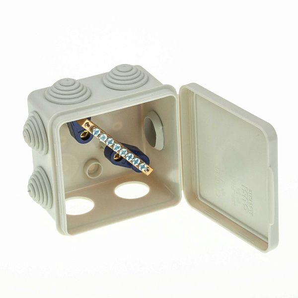 В коробке установлена 8-гнёздная нулевая шина с креплением по бокам на изоляторах.