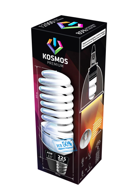 Энергосберегающие лампы КОСМОС 45Вт создают мягкий рассеивающий свет, специально разработаны с учетом требований российских и европейских законов и подходят ко всем осветительным устройствам со стандартным патроном E27, при использовании переходника на Е40 может быть использована в открытых светильниках НСП-17.