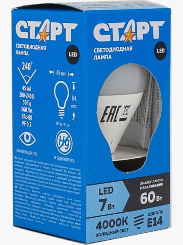 Потребляемая мощность 7 Вт, аналог лампы накаливания на 60 Вт.