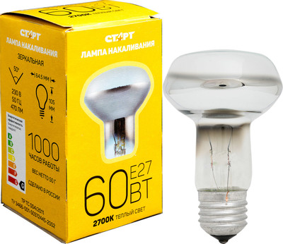 Лампа СТАРТ R63 60Вт E27 Лампы накаливания СТАРТ комплектуется цоколем Е27, используемым во всех видах светильников.