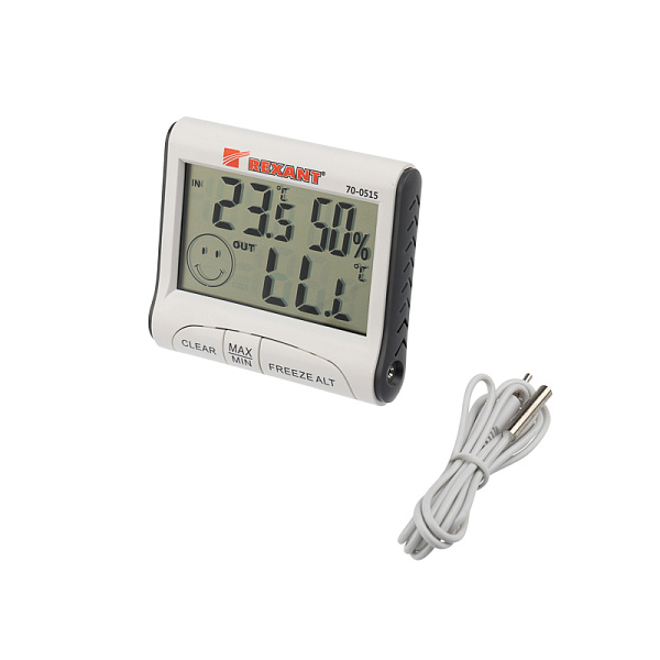 Термогигрометр комнатно-уличный REXANT с проводным выносным датчиком предназначен для измерения показаний температуры внутри и снаружи помещения, а также внутренней влажности воздуха.