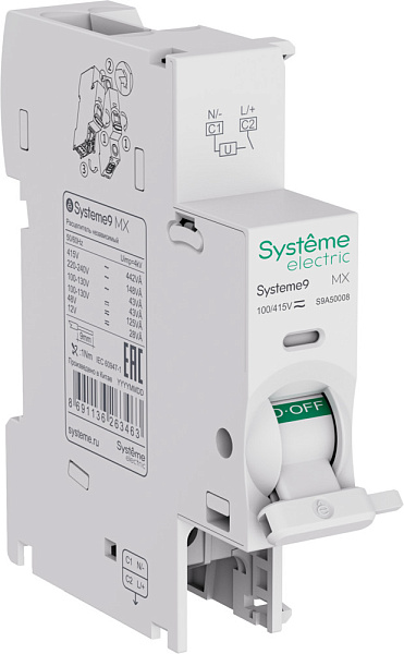 Присоединяется к автоматическим выключателям, автоматическим дифференциальным выключателям, выключателям дифференциального тока и блокам дифференциального тока (монтаж на АВ) серии Systeme9, для реализации функции дистанционного отключения и сигнализации.