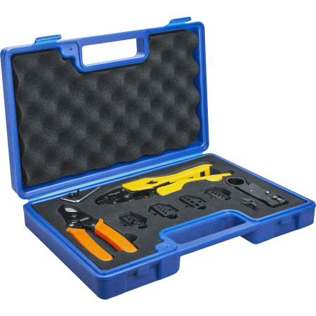 Набор включает пять самых востребованных сменных матриц с овальными, трапециевидными, лепестковыми и клиновидными профилями обжима, а также ножницы и съемник изоляции для коаксиального кабеля.