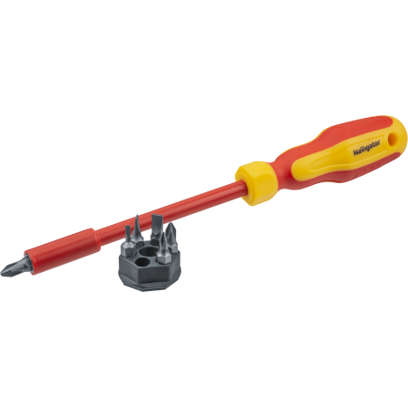 Диэлектрическая отвертка с набором сменных бит Navigator NHT-Оtd02-H6 предназначена для работы в электрических сетях и силовых токопроводящих точках, находящихся под напряжением до 1000 В.