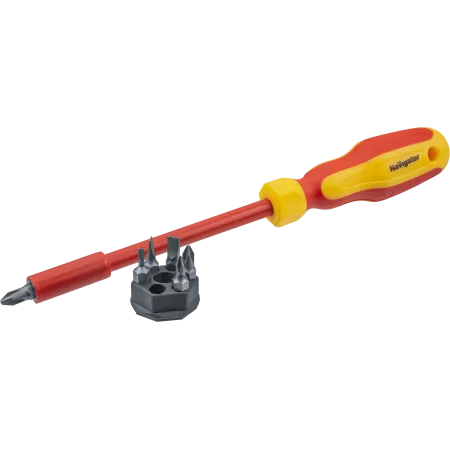 Диэлектрическая отвертка с набором сменных бит Navigator NHT-Оtd02-H6 предназначена для работы в электрических сетях и силовых токопроводящих точках, находящихся под напряжением до 1000 В.
