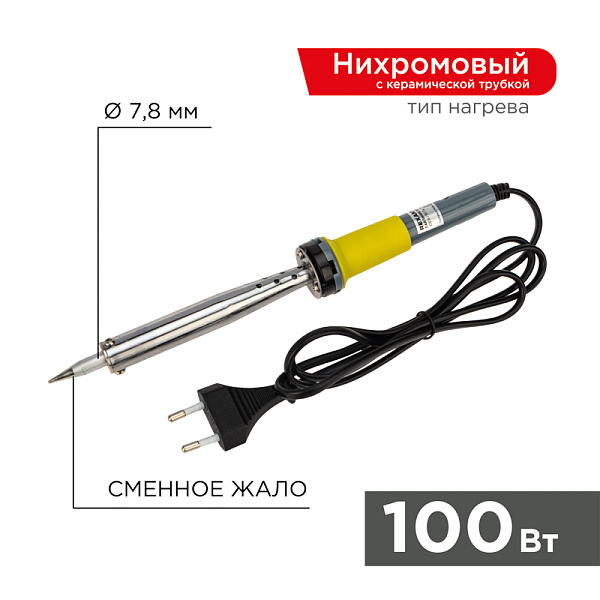 Паяльник с долговечным жалом мощностью 100Вт REXANT предназначен для ручного монтажа/демонтажа деталей среднего и крупного размера, а также для лужения.