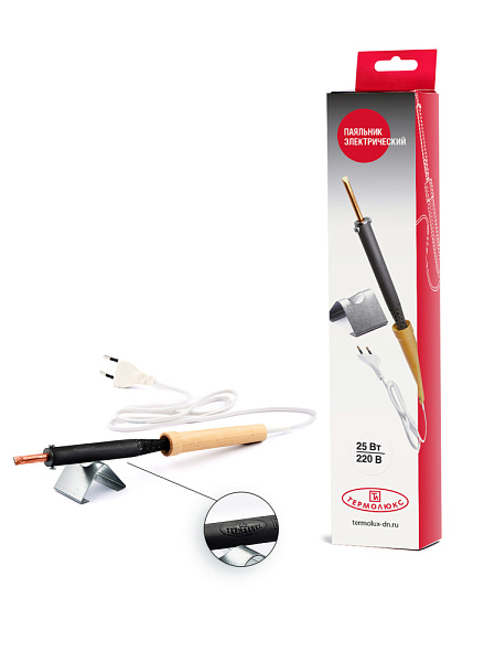 Паяльник электрический «ТЕРМОЛЮКС» ЭПСН-25/220, мощностью 25Вт, напряжением 220В в картонной коробке с металлической подставкой предназначен для пайки электронных схем.