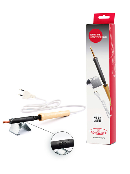 Паяльник электрический «ТЕРМОЛЮКС» ЭПСН-03-65/220, мощностью 65Вт, напряжением 220В в картонной коробке с металлической подставкой предназначен для пайки электротехнических изделий и электропроводки.