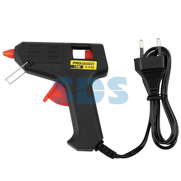 Принцип работы: клеевой стержень плавится в металлической камере с помощью нагревательного устройства и для точного дозирования при нажатии на курок подается из сопла на склеиваемую поверхность.