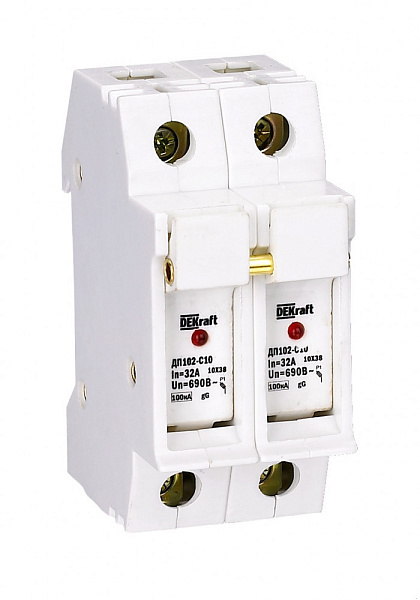 Держатель серии ДП-102 цилиндрического предохранителя ПЦ-102 Dekraft; 2P; для габарита С10 (10 x 38 мм); со светодиодной индикацией срабатывания; номинальный ток – до 32 А; ширина – 2 мод.