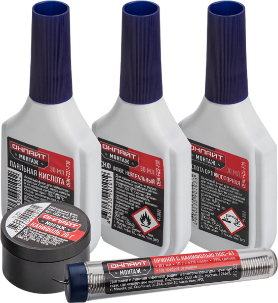 В наборе: канифоль (20 г), флюс СКФ (30 мл), паяльная кислота (30 мл), ортофосфорная кислота, припой с канифолью ПОС-61 (вес 10 г, диаметр 1 мм)