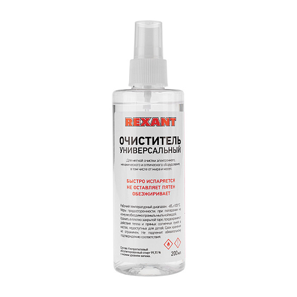 Очиститель универсальный 200 мл (с распылителем) REXANT предназначен для «мягкой» очистки или обезжиривания различных предметов.