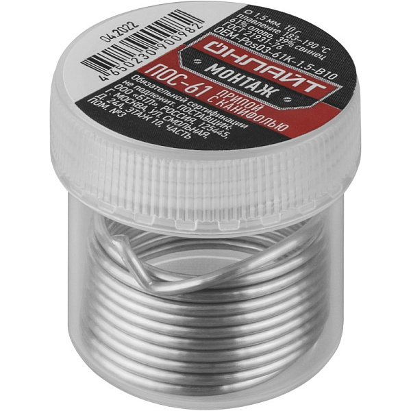 Припои с канифолью ПОС-61 Онлайт Монтаж предназначены для пайки и лужения радио- и электроаппаратуры, печатных схем, где недопустим перегрев.