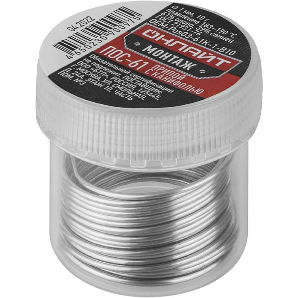 Припои с канифолью ПОС-61 Онлайт Монтаж предназначены для пайки и лужения радио- и электроаппаратуры, печатных схем, где недопустим перегрев.