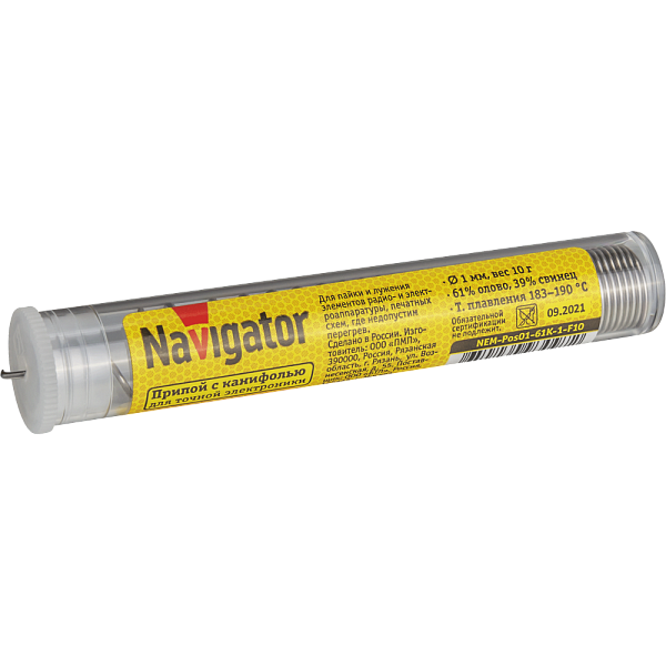 Припои с канифолью ПОС-61 Navigator предназначены для пайки и лужения радио- и электро-аппаратуры, печатных схем, где недопустим перегрев.