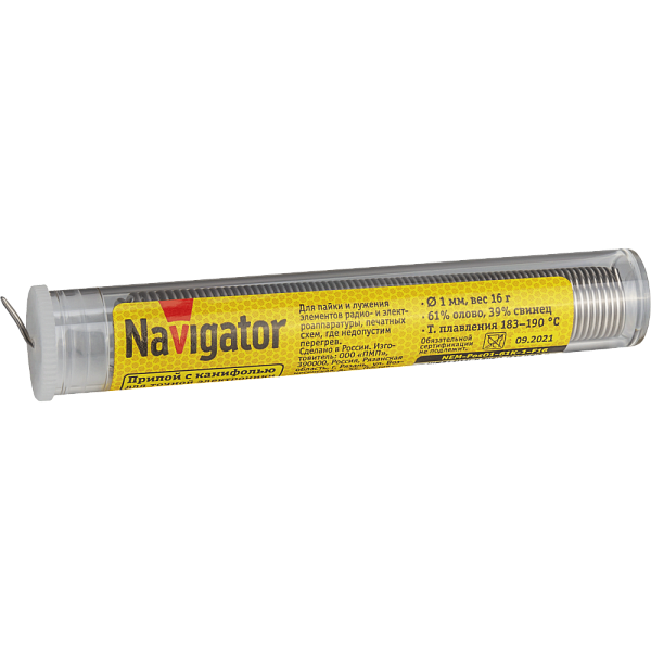 Припои с канифолью ПОС-61 Navigator предназначены для пайки и лужения радио- и электро-аппаратуры, печатных схем, где недопустим перегрев.